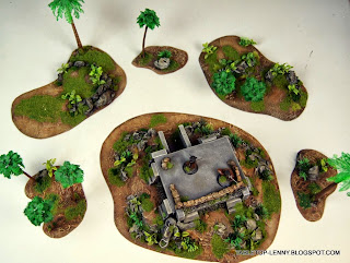 This is one of my newest finished commission projects. A part of a jungle terrain set which is divided into two different more or less generic sets. A fantasy or dark age like set and a futuristic or contemporary set. The bunker obviously belongs to the last aspect of the project. Vegetation-bases and hills are usable for both variants. So you have a lot of possibilities for setting up games.